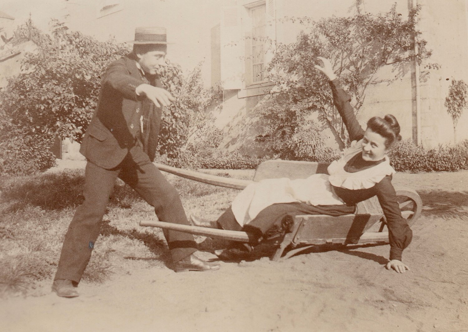 A man and woman having fun in a garden, playing with a wheelbarrow. Both are nicely dressed, not wearing working clothes for the garden. Are they lovers? Or siblings just having fun together?