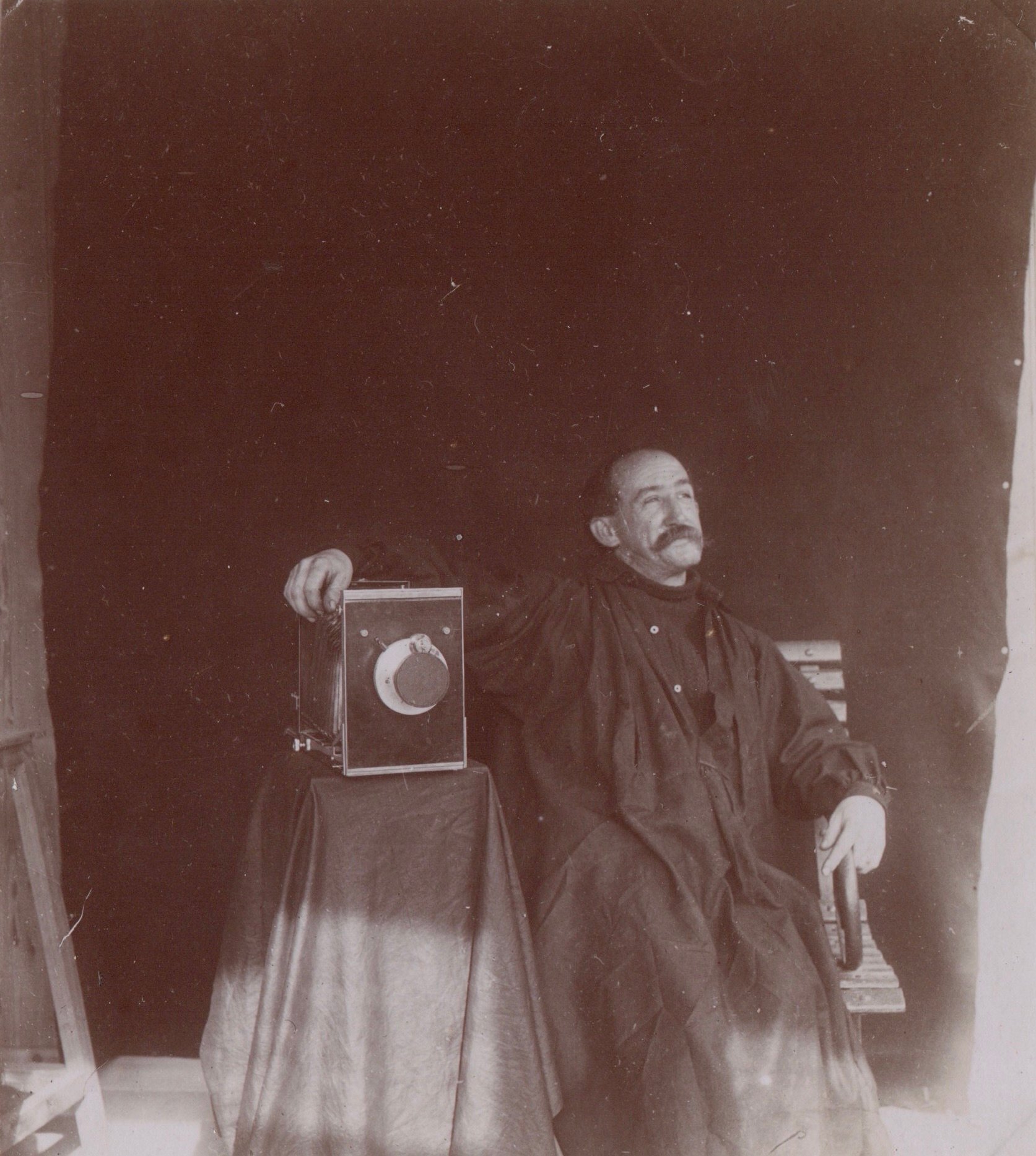 A lovely portrait (self-portrait?) of an unknown photographer posing with his bellows camera. He wears a work apron. A dark backdrop is hanging behind the man.