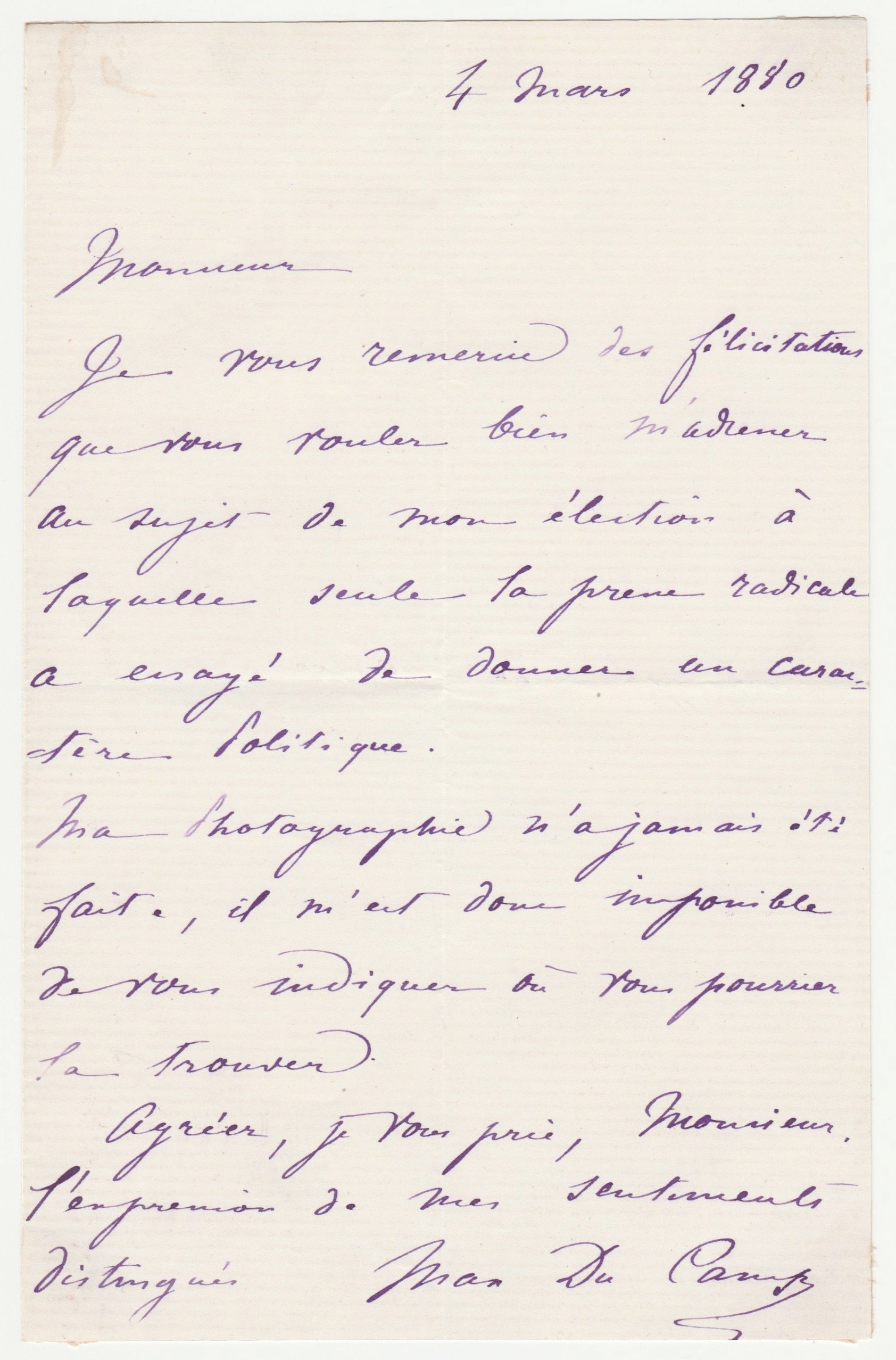 A letter in the hand of Maxime du Camp, 4 Mars 1880.