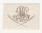 Ex Libris, or bookplate, with monogram MDC above two crossed writing plumes.