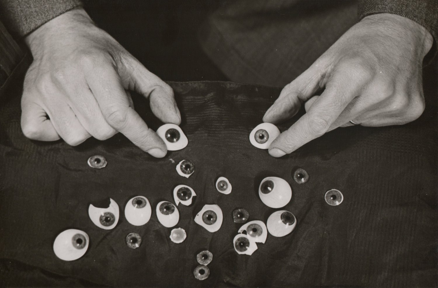 A surrealistic press photo by "Photo Maurice". Two hands each hold a glass eye. Twenty different glass eyes lie on a dark corduroy fabric.