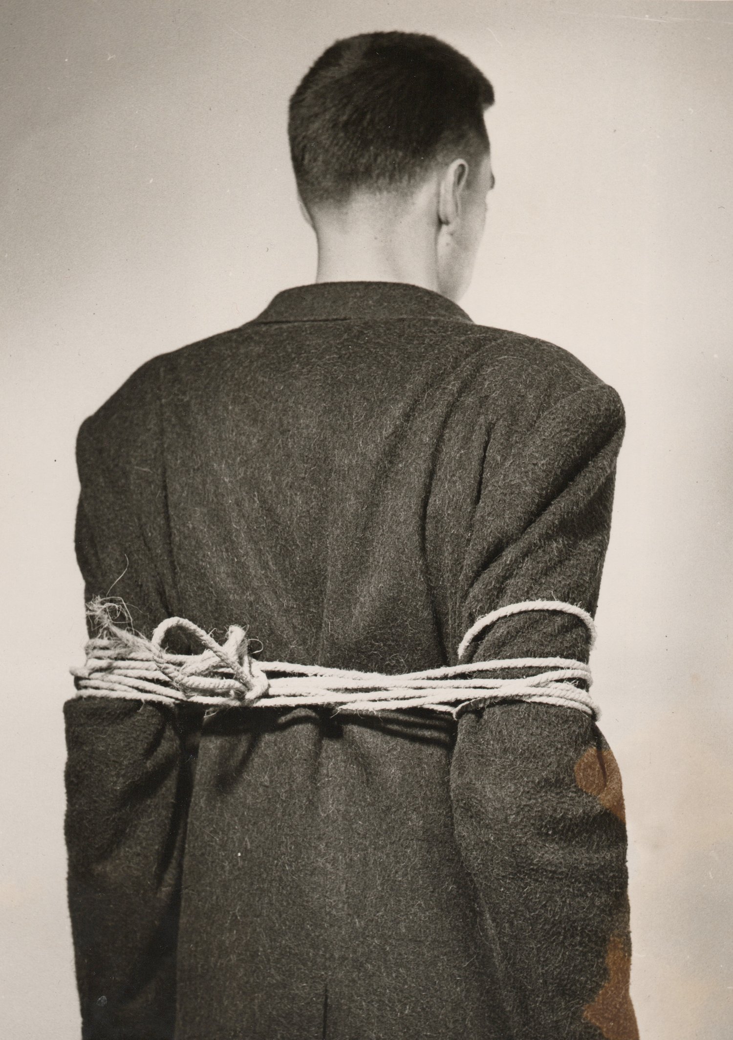 A tied up man in a suit. According to the title on the back, "La evasion misteriosa", this photo shows an escapologist.